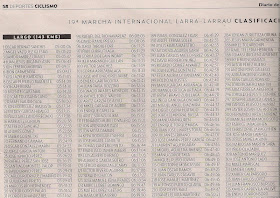 De salida se subía el Col de Pierre de St. Martin, el cual se subió muy rápido, y con mucho viento de cara,lo que hizo que nos quedáramos en cabeza unos 40 corredores, después de largo descenso,íbamos en busca del Col de Issarbe, en el cual se marcharían por delante unos 25 corredores, a los cuales yo no les pude seguir, durante la bajada de este puerto tuve un percance mecánico, que apunto estuvo de tirarme al suelo, y el cual me hizo perder contacto con el grupo de 4 corredores en el que viajaba.Una vez solventado el problema, a seguir dando pedales para llegar a los pies del Col de Larrau, un puerto de 28 km. durisimos, en el cual sufrí mucho, ya que es una pared constante, y en algunos tramos del puerto no pase de 8 km/h, y a parte me iban dando muchos calambres en las piernas, pero a base de sufrimiento consegui llegar a la cima,y en la bajada pude reponerme, y seguir hasta meta sin problema, al finalizar esta bajada,comenzaba la ascensión al último puerto de la jornada, el Alto de Laza, que después de los tres colosos que dejamos atrás,este se sube muy bien, y de la cima a meta terreno bastante favorable.